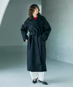このコートは、尾州産の上質ウールを使用し、二重織で丁寧に仕上げられたロングコート。シルエットの美しさと素材の高級感を兼ね備えた逸品として、多くのファッション好きに支持されています。